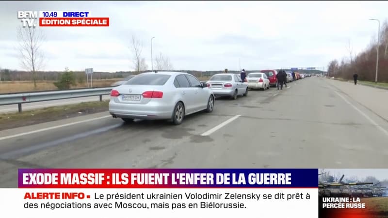 Les voitures s’accumulent les unes derrière les autres à quelques kilomètres de la frontière polonaise où les Ukrainiens s’enfuient. Ils tentent d’échapper à la guerre menée par la Russie depuis maintenant quatre jours.