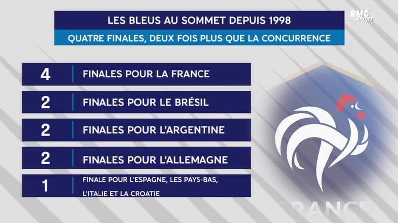 Combinez les finales jouées par le Brésil, l’Allemagne – vainqueurs de 9 Coupes du monde – depuis 1998 et vous obtenez 4. 4 finales à elle-deux, c’est déjà colossal. Et c’est pourtant le même nombre que les Bleus à eux-seuls ont joué sur la même période.