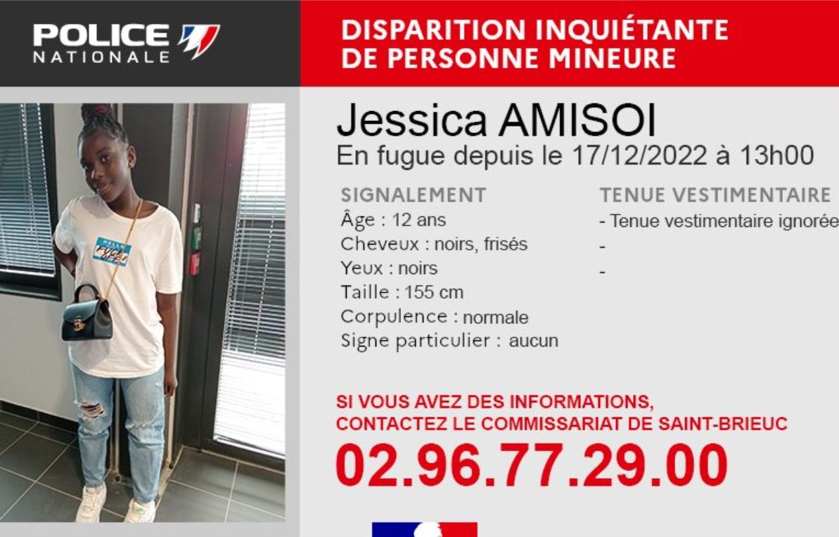 Sa disparition est jugée inquiétante par les policiers. Un appel à témoins a été lancé sur les réseaux sociaux pour tenter de retrouver Jessica Amisoi dans les Côtes-d’Armor. Âgée de 12 ans, la jeune fille a quitté le domicile familial à Saint-Brieuc samedi après-midi et n’est pas rentrée chez elle depuis.L’adolescente a les cheveux noirs et frisés, les yeux noirs et mesure 1,55 m. On ignore par contre la tenue vestimentaire qu’elle portait au moment de sa fugue. Toute personne pouvant faire avancer l’enquête est invitée à contacter au plus vite le commissariat de Saint-Brieuc au 02.96.77.29.00. SociétéVannes : Un appel à témoins lancé après la disparition d’un adolescent de 17 ansFaits diversIlle-et-Vilaine : La femme de 34 ans portée disparue retrouvée vivante