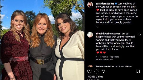 Non invitée à la cérémonie du couronnement, Fergie a exprimé sa gratitude sur Instagram le 11 mai 2023 pour sa présence au concert de couronnement de Charles III. Pour l’occasion, l’ex-femme du duc d’York, Sarah Ferguson, a partagé une magnifique photo d’elle entourée de ses deux filles, les princesses Eugenie et Beatrice d’York. Sur la photo, Eugenie d’York porte la même robe blanche à manches bouffantes. “Le week-end dernier, j’ai assisté au concert du couronnement avec mes filles. Je me suis sentie très chanceuse d’avoir été invitée et d’avoir participé à ce concert envoûtant et à ces performances magiques“, a écrit Sarah Ferguson avant de conclure : “C’était un honneur de pouvoir en profiter ensemble et j’en suis profondément reconnaissante“.