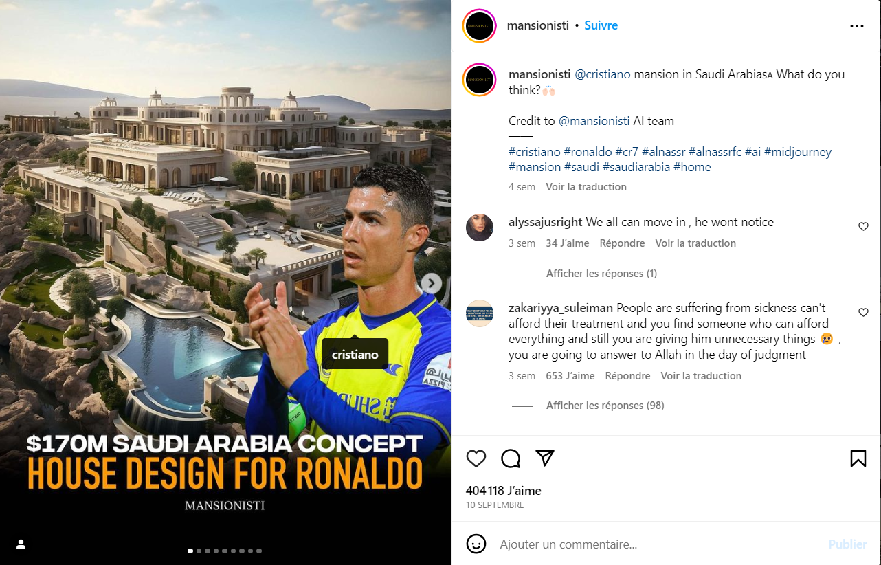 <p><a href=”https://www.closermag.fr/people/cristiano-ronaldo-pourquoi-met-il-du-vernis-a-ongles-noir-sur-ses-orteils-3231933?utm_source=rss_feed&utm_medium=link&utm_campaign=unknown”><strong>Cristiano Ronaldo</strong></a> fait actuellement partie des <strong>footballeurs les plus riches</strong> du monde. Rappelons qu’après son départ de Manchester United, la star du ballon rond a signé un gros contrat avec Al-Nassar dans le<a href=”https://www.telestar.fr/actu-tv/canal-la-chaine-cryptee-acquiert-les-droits-du-championnat-saoudien-et-de-ses-nouvelles-stars-834120?utm_source=rss_feed&utm_medium=link&utm_campaign=unknown”> <strong>championnat saoudien</strong></a>. On parle d’un contrat record de <strong>200 millions d’euros par an</strong>. Ajoutons le fait que le sportif de 38 ans vaut plus d’un milliard de dollars, selon le magazine <em>Forbes</em>. Vivre dans une <strong>maison à 160 millions d’euros</strong> serait donc tout à fait normal pour lui. Rappelons qu’actuellement Cristiano Ronaldo et sa famille vivent dans<a href=”https://www.closermag.fr/people/karim-benzema-800-m2-piscine-salle-de-sport-6-chambres-cette-incroyable-maison-a-5-millions-quil-va-delaisser-3221190?utm_source=rss_feed&utm_medium=link&utm_campaign=unknown”> <strong>une maison</strong></a> à 12 millions d’euros en Arabie Saoudite.</p> <p>Cette maison à 160 millions d’euros a été imaginée par une IA ou Intelligence Artificielle de chez <strong>Mansionisti</strong>. Cette dernière est une équipe d’architectes spécialisée dans la conception de résidences de rêve sur mesure. Pour concevoir cette œuvre d’art, l’IA a pris en compte les besoins du footballeur ainsi que <strong>son style de vie</strong>. La propriété se démarque avant tout par une architecture finement mixée entre locale et occidentale. Design classique associé au moderne sont donc les maîtres mots de la conception. Dès l’entrée, on comprend la majesté de la villa. Large escalier, lustre imposant… tout donne l’impression d’<strong>être dans un palais</strong>.</p> <blockquote class=”embedly-card” data-card-controls=”1″…<a href=”https://www.closermag.fr/people/cristiano-ronaldo-decouvrez-la-maison-decadente-a-160-millions-deuros-imaginee-pour-lui-photos-3277049?utm_source=rss_feed&utm_medium=link&utm_campaign=unknown”>See more pictures on Closer</a><meta name=”original-source” content=”https://www.closermag.fr/people/cristiano-ronaldo-decouvrez-la-maison-decadente-a-160-millions-deuros-imaginee-pour-lui-photos-3277049″ /><meta name=”syndication-source” content=”https://www.closermag.fr/people/cristiano-ronaldo-decouvrez-la-maison-decadente-a-160-millions-deuros-imaginee-pour-lui-photos-3277049″ /><meta name=”robots” content=”noindex, follow” />