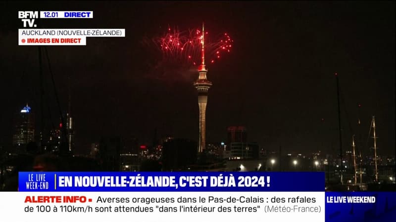 Les feux d’artifice tirés depuis la Sky Tower illuminent le ciel d’Auckland en Nouvelle-Zélande pour célébrer le passage en 2024.