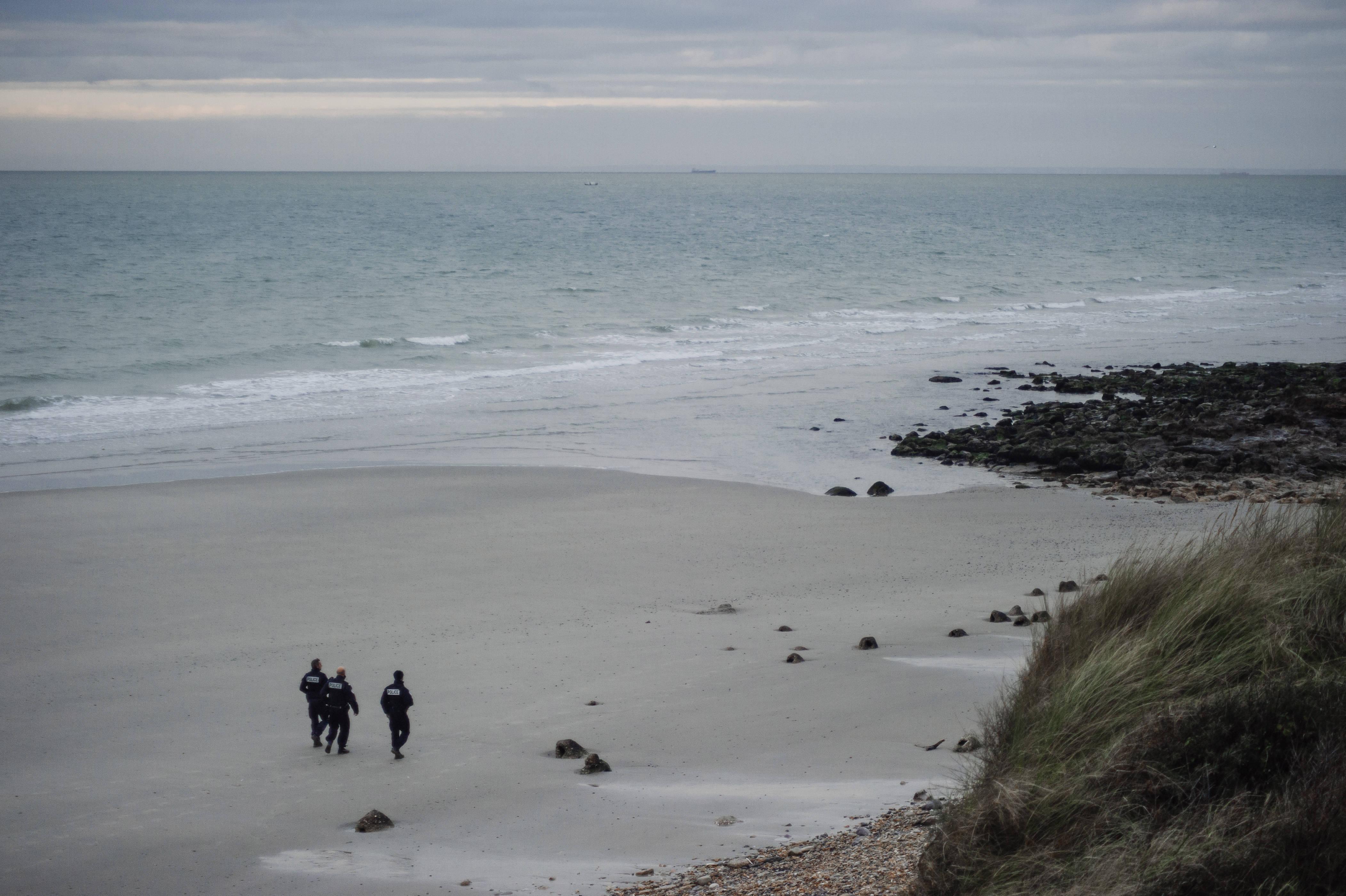 Policiers en patrouille sur la plage de Calais.