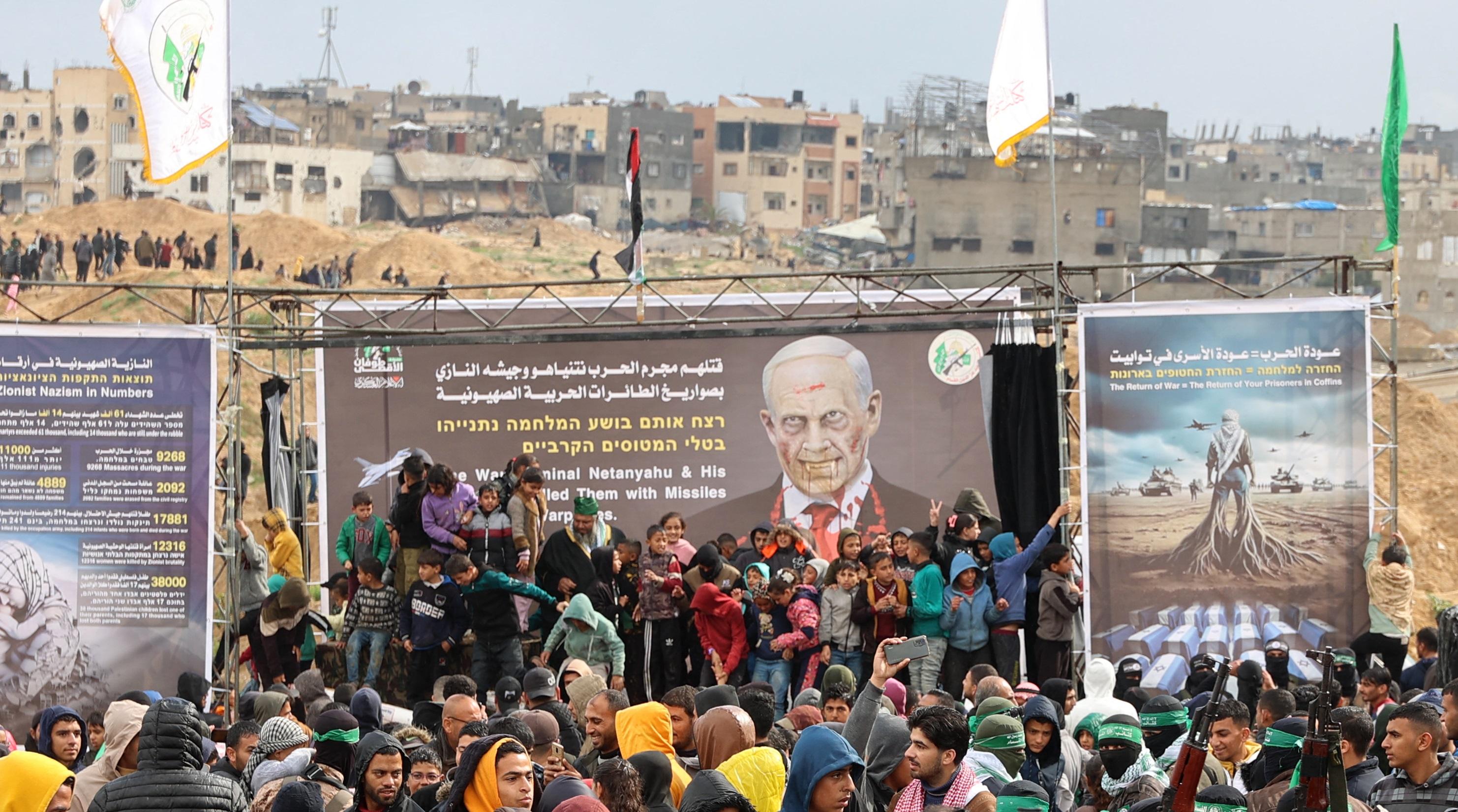 Lors d’une cérémonie organisée à Khan Younès, dans le sud de la bande de Gaza, des combattants cagoulés et armés du mouvement islamiste palestinien ont exposé sur un podium quatre cercueils portant chacun la photo d’un des otages, rapporte l’AFP. Au-dessus, un poster présente le Premier ministre israélien Benyamin Netanyahou, le visage maculé de sang et affublé de dents de vampire.