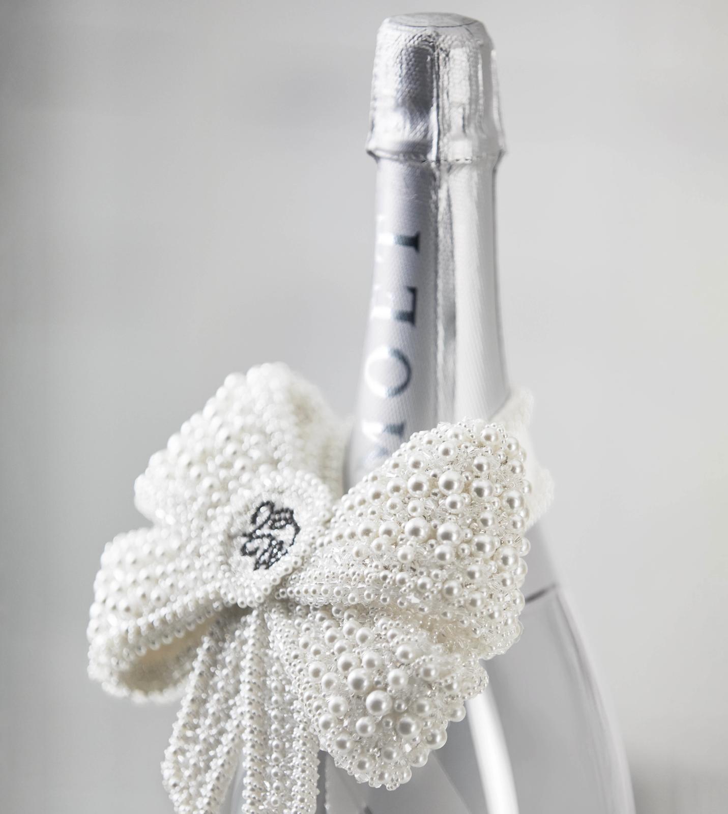 Chacun de ces jéroboams de Moët Impérial se distingue par une finition en miroir chromé, un procédé artisanal unique pour un résultat fantasmagorique. Bien sûr, on retrouve le nœud perlé emblématique de la collaboration. Entièrement réalisé en France par l’atelier parisien Baqué Molinié, chaque nœud a mobilisé plus de 300 heures de travail et 7 310 perles pour donner vie à ces pièces d’exception. Un savoir-faire qui n’est pas sans rappeler la minutie nécessaire à l’élaboration d’une cuvée de champagne : dans les plus de 1 000 hectares de vignoble ou dans la manufacture parisienne, le même souci du détail et du beau guide la main des vignerons et artisans.